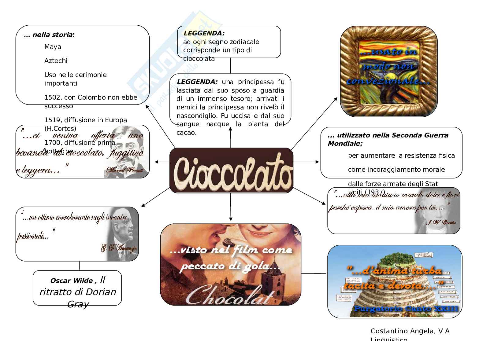 In questa tesina viene analizzato il cioccolato, con collegamenti interdisciplinari con i seguenti argomenti trattati: Il Piacere in D'Annunzio, in Inglese viene effettuato un collegamento con The picture of Dorian Gray del celebre scrittore Oscar Wilde; in Francese viene riportato come esempio il lavoro di Proust, "La petite madeleine", in Tedesco la seguente tesina di maturità descrive il pensiero letterario di W. Goethe. In ambito storico viene effettuato un legame con la Seconda guerra mondiale, in cui vi è il coinvolgimento degli Stati Uniti. Infine in Storia dell'arte la tesina descrive la corrente letteraria dadaista, Duchamp e l'uso del cioccolato in modo non convenzionale.
