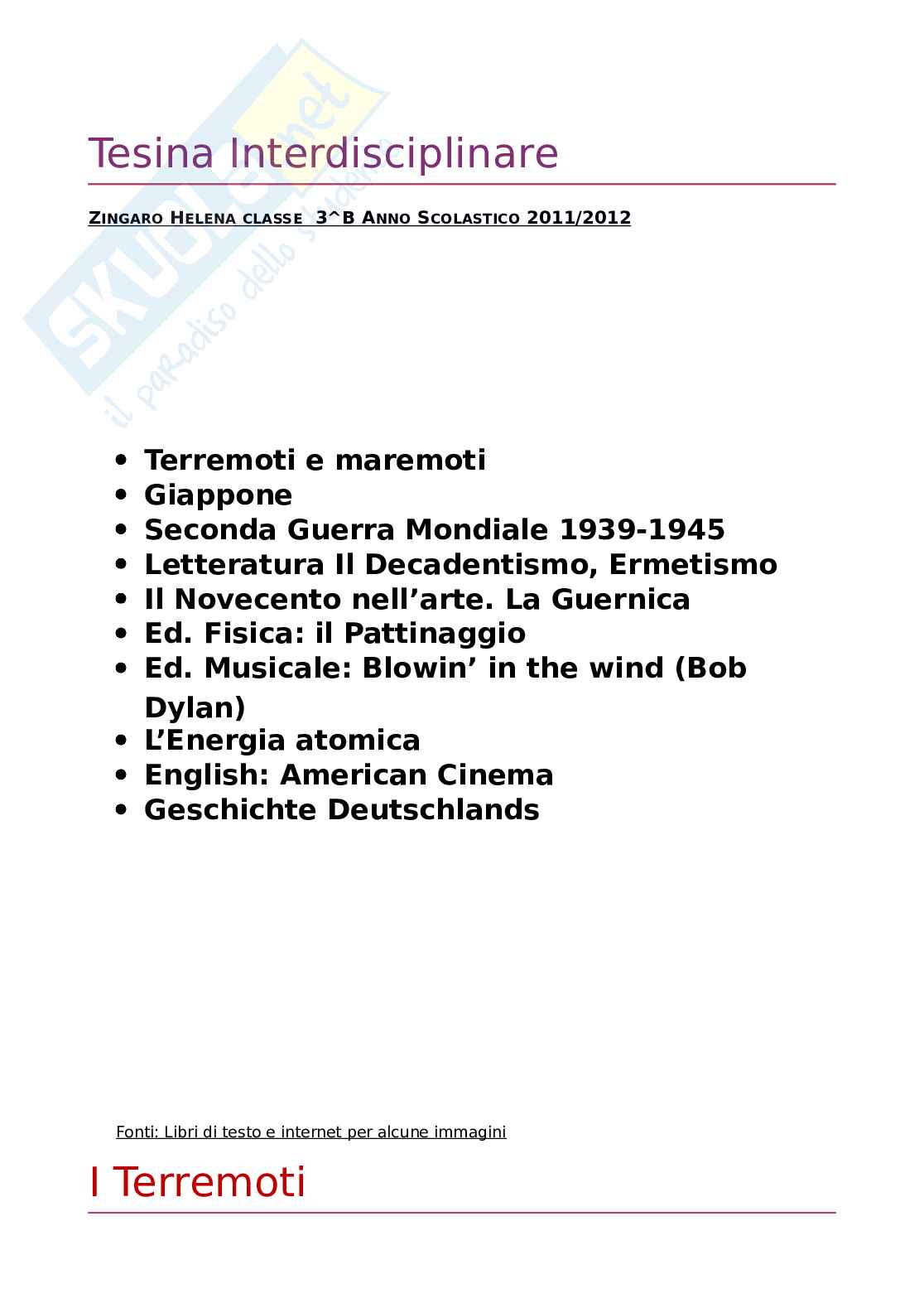 La seguente tesina di terza media descrive i terremoti e permette i collegamenti seguenti: in Scienze: I terremoti; in Geografia: Il Giappone, in Storia: Seconda guerra mondiale; in Reportage gita a Monaco: Testimonianze dell'orrore nazista; in Italiano: Decadentismo e ermetismo; in Arte: La guernica; in Educazione fisica: Il pattinaggio; in Educazione musicale: Blowin' in the wind; in Educazione tecnica: L'energia atomica; in Inglese: American cinema e in Tedesco: Geschichte Deutschlands.