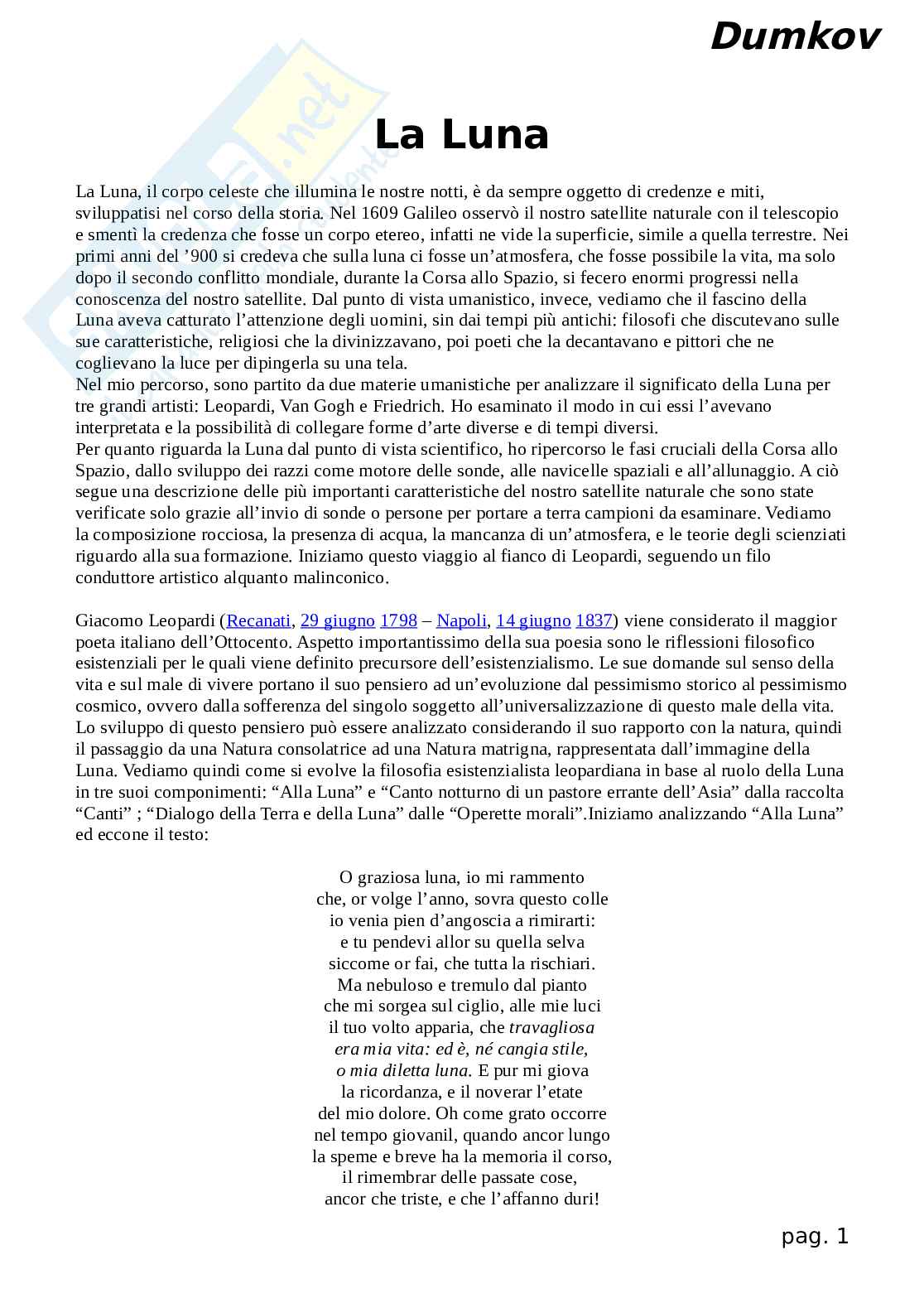 Luna”, scritto nell’aprile del 1824. Questa particolare composizione di Leopardi consiste in un dialogo