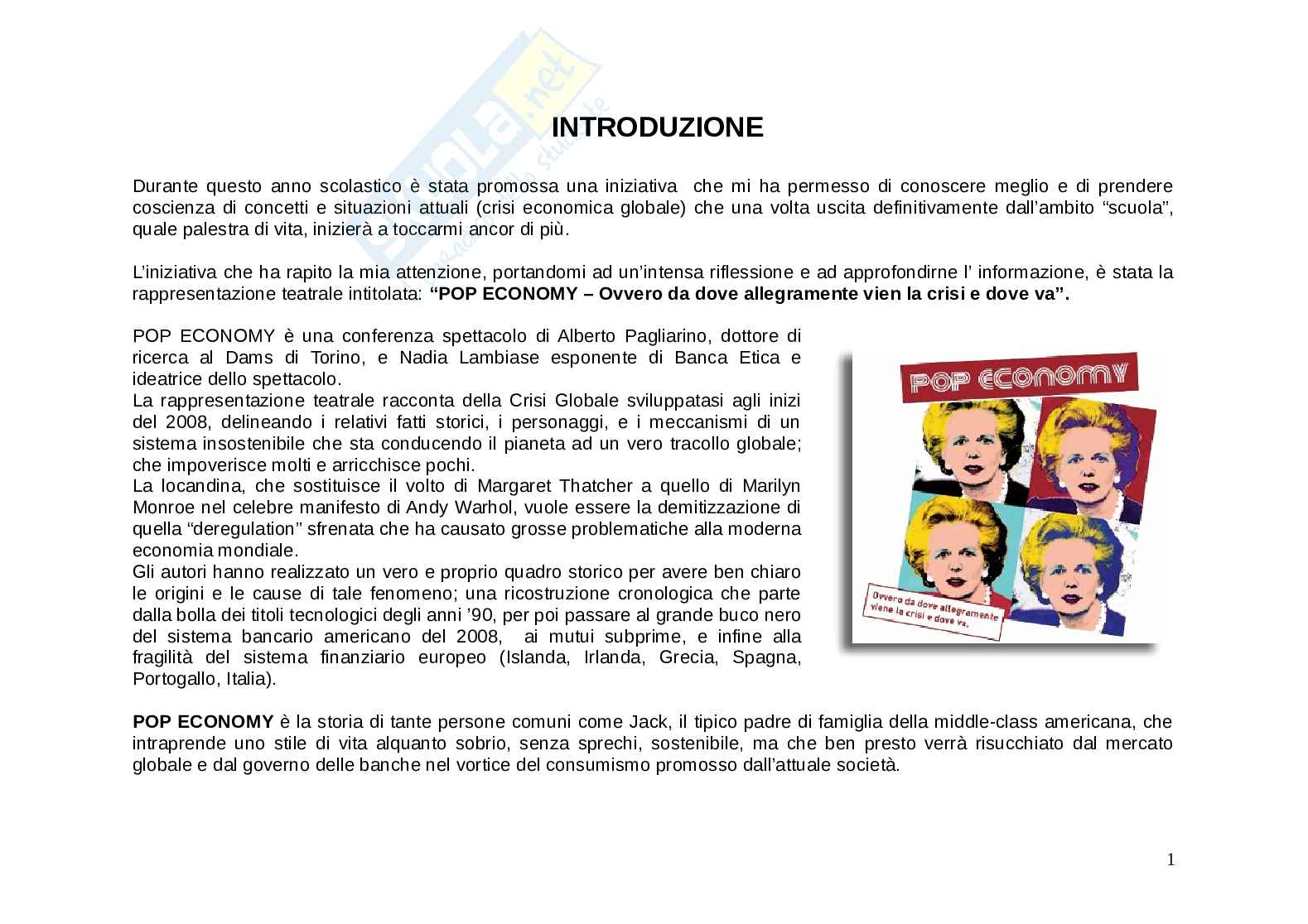 Proprio grazie a questa iniziativa ho deciso di volermi documentare e informare maggiormente sulla crisi di tipo economico-finanziario che stiamo vivendo, mettendo insieme i vari pezzi del puzzle e magari riflettere e conoscere realtà che promuovono un’ economia di tipo alternativo, rinunciando a un’economia di consumo per aderire a un economia partecipativa. Quindi l'obiettivo della mia tesina è quello di descrivere la crisi mondiale attuale, partendo dalla conferenza Pop Economy, effettuando dei collegamenti con le varie materie di studio.