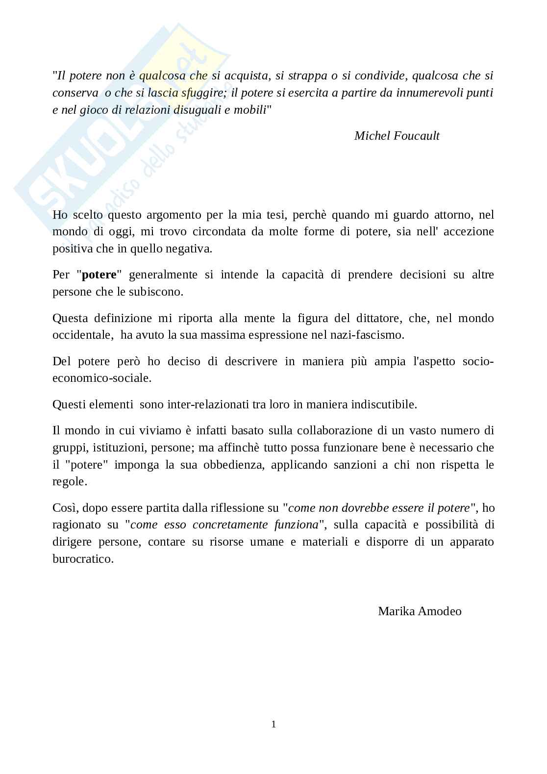 Il mondo in cui viviamo è, infatti, basato sulla collaborazione di un vasto numero di gruppi, Istituzioni, persone; affinché tutto possa funzionare bene è necessario che il "potere" imponga la sua obbedienza, applicando sanzioni a chi non rispetta le regole. Così, nella tesina, dopo essere partita dalla riflessione su "come non dovrebbe essere il potere", ho ragionato su "come esso concretamente funziona", sulla capacità e possibilità di dirigere persone, contare su risorse umane e materiali e disporre di un apparato burocratico.
