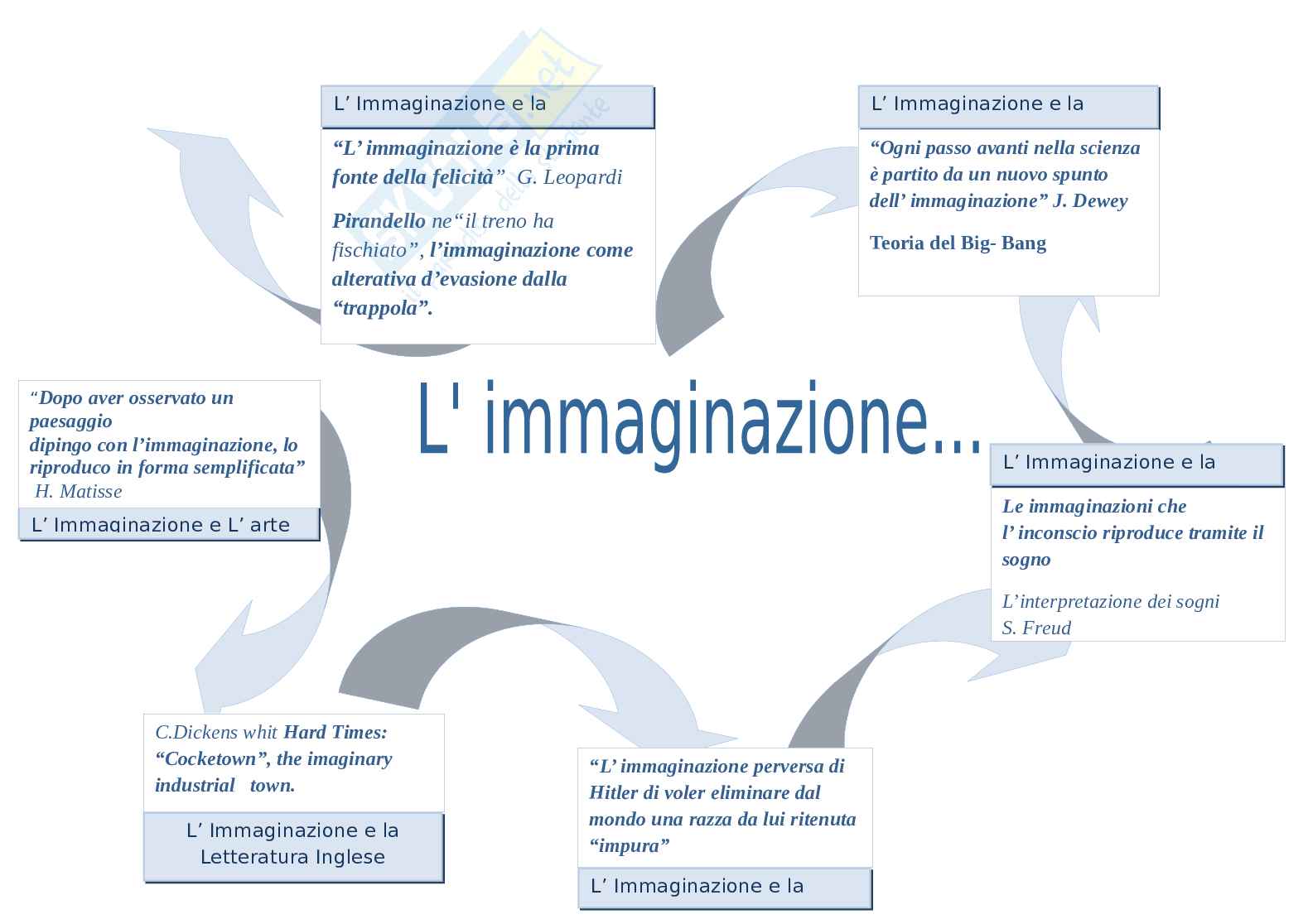L'obiettivo di questa tesina di maturità è quello di analizzare il tema dell'immaginazione, seguendo un percorso di studi multidisciplinare. Gli argomenti trattati sono i seguenti: l'immaginazione come fonte di prima di felicità secondo Leopardi, la teoria del Big-Bang, Hard Times di Dickens.