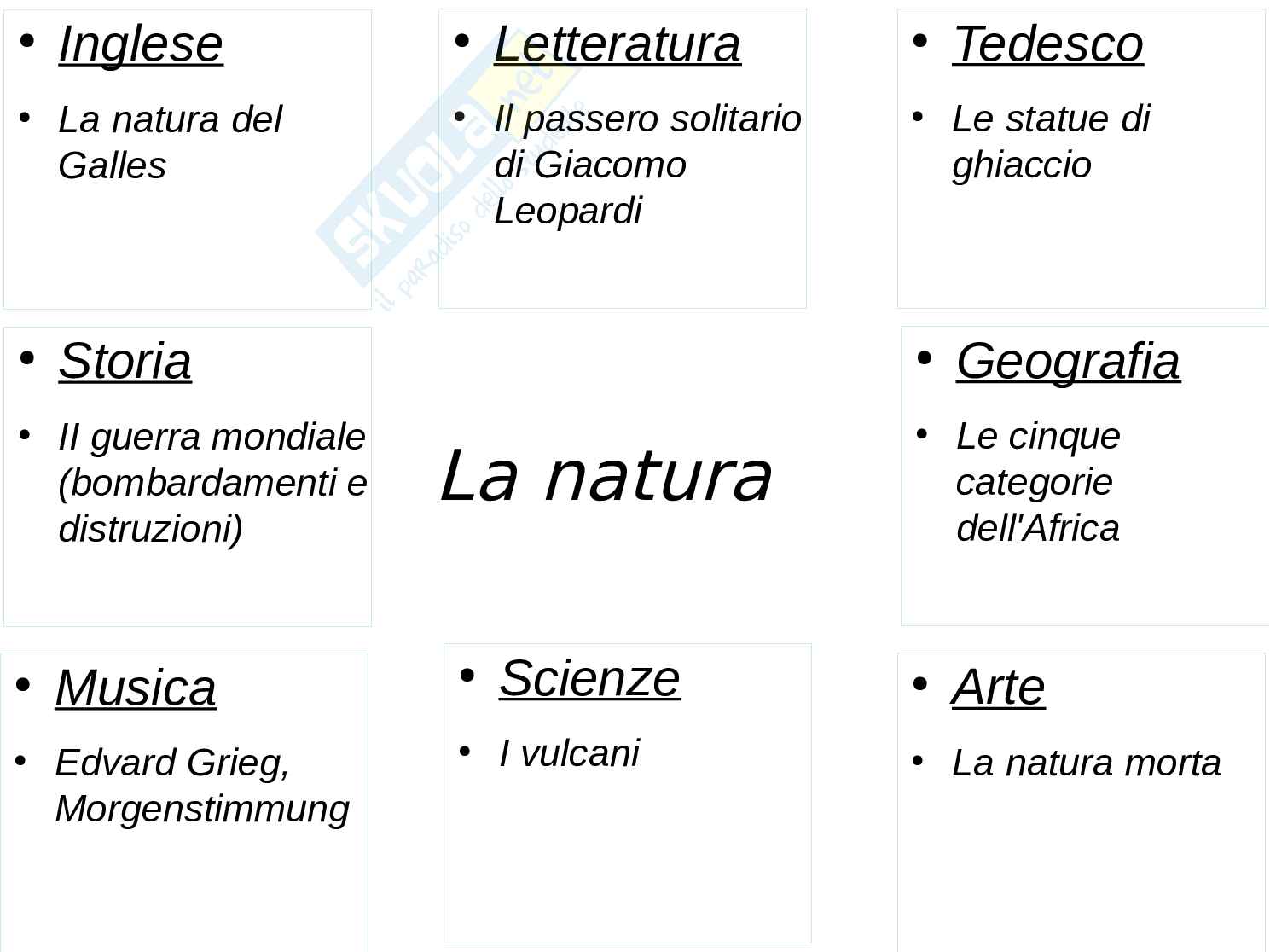 La tesina descrive la natura. La tesina di terza media prende in esame i seguenti argomenti: in Inglese la natura del Galles, in Letteratura italiana Leopardi e Il passero solitario, in Tedesco le skulute die ghiaccio, in Arte la natura morta, in Geografia l'Africa, in Storia il bombardamento atomico di Nagasaki e Hiroshima, in Scienze i vulcani, in Musica Edvard Grieg.
