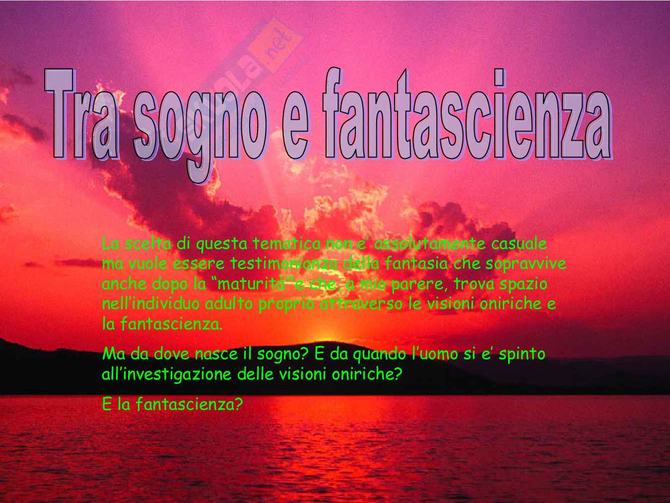 La scelta di questa tematica per la tesina di maturità non e' assolutamente casuale ma vuole essere testimonianza della fantasia che sopravvive anche dopo la "maturità '"e che, a mio parere, trova spazio nell'individuo adulto proprio attraverso le visioni oniriche e la fantascienza. Ma da dove nasce il sogno? E da quando l'uomo si e' spinto all'investigazione delle visioni oniriche? E la fantascienza?
