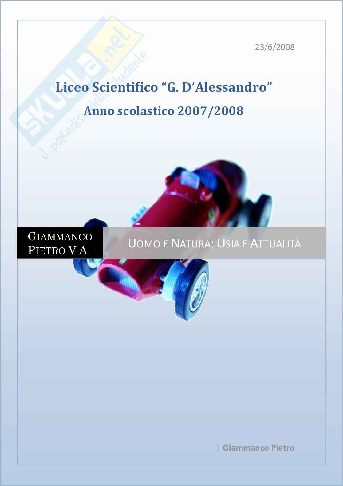 Sommario: E' mio compito sottoporre alla vostra attenzione l'argomento in oggetto prescelto per l'ideazione, la progettazione, lo svolgimento della tesina "Uomo e Natura: usia e attualità ". Oggetto del presente lavoro risultano l'analisi e insieme la discussione di due elementi topici quali l'uomo e la natura, contemplati nella loro archetipica dicotomia. Occorre quindi rilevare come tale rapporto si sia sempre connotato come una evidente usia, cioè i due elementi uomo e natura risultano tanto inter-dipendenti da risultare quasi consustanziati pur nelle loro rispettive differenze. Ciò impone una anamnesi, e in senso storico e in senso tematico, delle relazioni che in ambito sincronico o diacronico sono intercorse all'interno delle coppie uomo-natura, uomo-civiltà , uomo-progresso. Si impone quindi la necessità di esaminare, all'interno di tale dicotomia uomo-natura, tutti i fenomeni che, più o meno ricollegabili all'azione umana, dunque antropici, hanno concorso, nel tempo, a variare o a trasformare del tutto la "sub-stantia" della natura stessa, dunque l'inquinamento, il surriscaldamento globale (Global Warning), i disastri ecologici, quindi i catastrofismi della natura più o meno dipendenti dall'uomo, dalla civiltà , dal progresso. L'oggetto della mia tesina nasce da interessi personali pertinenti soprattutto a mie ricerche e documentazioni su tematiche fortemente attualizzanti, d'ambito tanto tecnico quanto scientifico. A tal proposito giova ricordare che il pretesto per l'ideazione del mio progetto di studio è costituito dalla visione e insieme dall'analisi di alcune testimonianze all'argomento dedicate, e in particolare il film documentario "Una scomoda verità " (titolo originale: "An Inconvenient Truth") di Al Gore del 2006, film ambientato in USA, peraltro vincitore di due Premi Oscar (nel 2007 come miglior documentario e per la miglior canzone di Melissa Etheridge); o anche dall'analisi e dall'ascolto di taluni "pezzi" musicali quale, ad esempio, "Eppure il vento soffia ancora" di Pierangelo Bertoli. A tale mio interesse hanno pure concorso, quali conoscenze strettamente personali, la visione e la discussione di reportage o notiziari multimediali di recentissima produzione, su catastrofi...