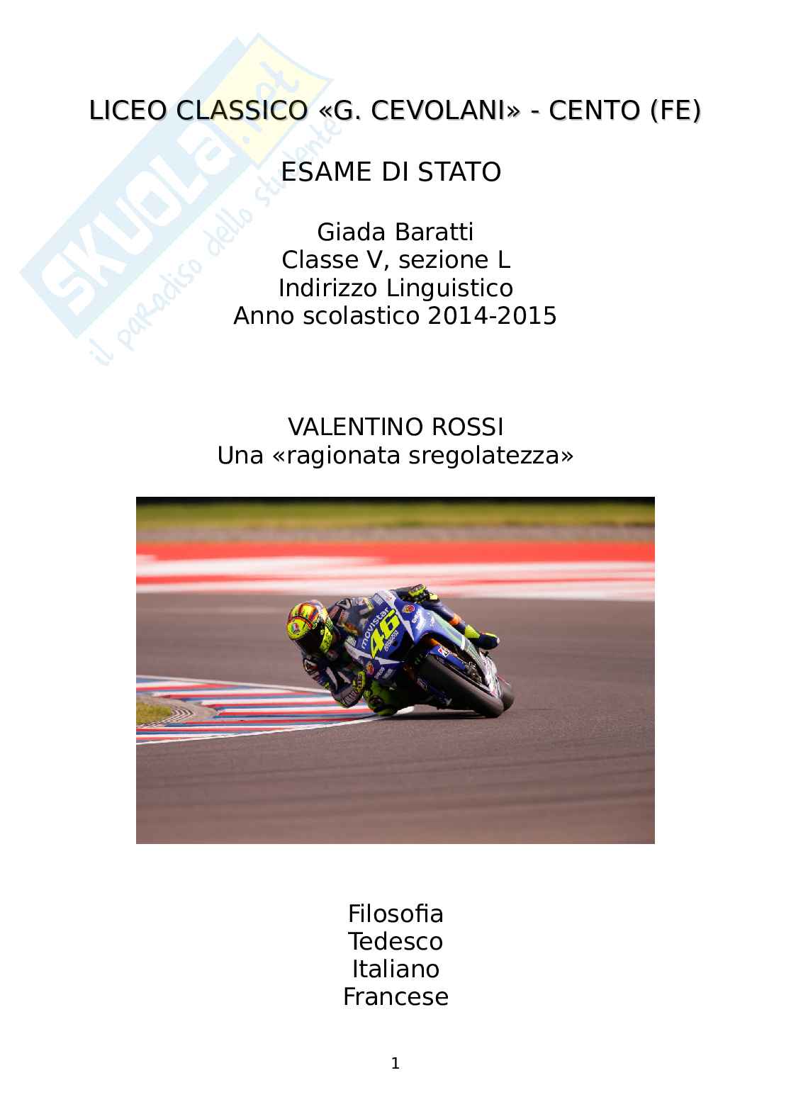 La seguente tesina tratta Valentino Rossi dal punto di vista umanistico. Il carattere che lo distingue per la sua forza interiore che lo spinge a seguire la propria volontà andando contro le critiche.