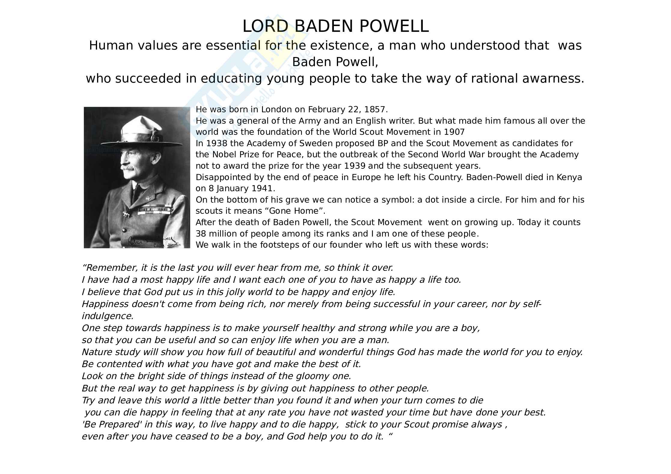 Disappointed by the end of peace in Europe he left his Country. Baden-Powell died in Kenya