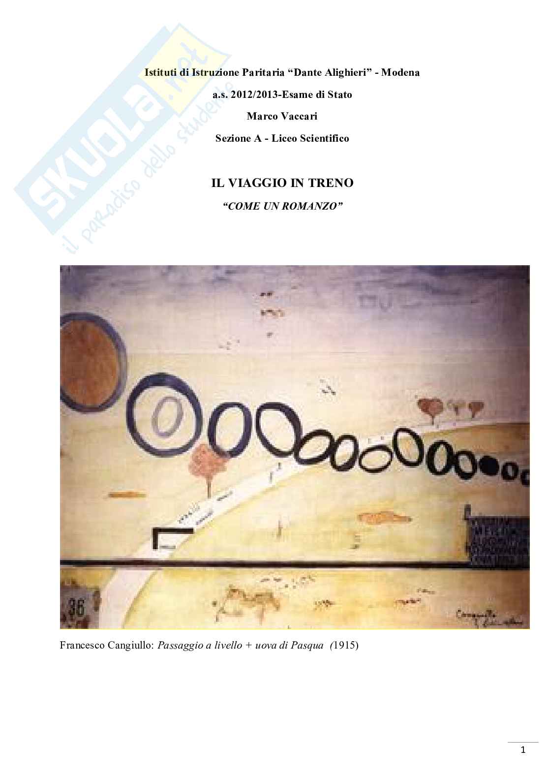 Questa tesina di maturità verte sul viaggio in treno. Alcune parole ben sottolineano la scelta dell’argomento che tratterò in questa tesina. La prima è massicciata. E’ una parola che pesa come piombo; ci sono le braccia robuste che l’hanno costruita, quelle che hanno picconato e frantumato la roccia, spinto le carriole; ci sono i binari con le traversine. E sopra di loro il viaggio. Questa è la seconda: quando si sa da dove si viene e dove si