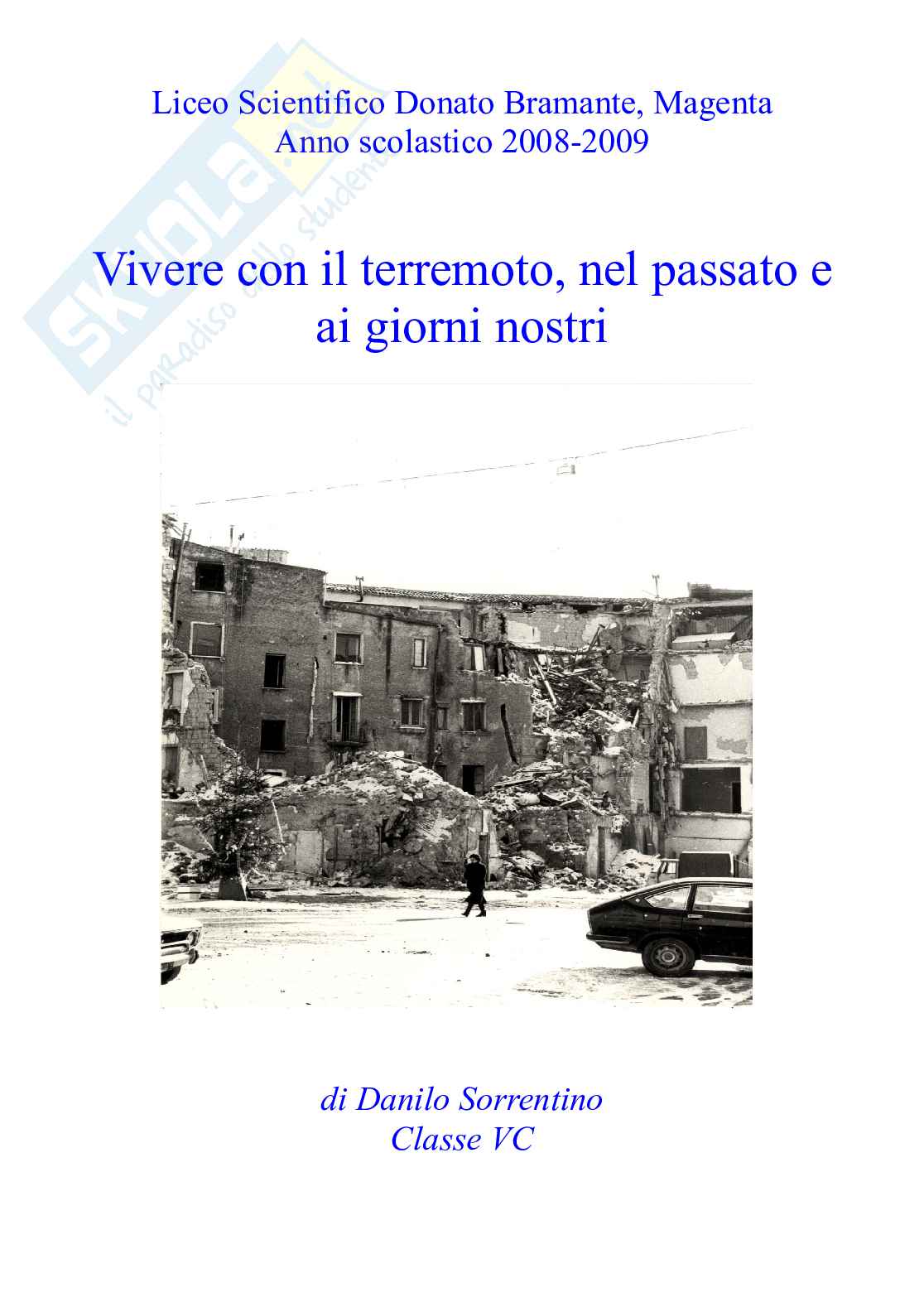 Descrizione: Il termine terremoto (dal latino terrae motus "movimento della terra") ha spesso evocato immagini di rovine, sofferenze, paure; ma queste sono immagini emotive che offrono solo una descrizione parziale del fenomeno: è difficile se non addirittura impossibile riuscire a spiegare nei minimi dettagli avvenimenti, come quelli avvenuti in Abruzzo all'inizio di Aprile, che lasciano ferite profonde nel cuore di ognuno. Questi eventi ci spingono a cercare le cause principali all'origine dei terremoti che colpiscono molte zone del mondo, tra cui anche l'Italia, al fine di elaborare modelli o previsioni su basi statistiche o deterministiche . Il lavoro si propone di trattare l'argomento in senso cronologico: prende inizio dall'antichità con Seneca che nelle "Naturales Questiones" dà una spiegazione di carattere per così dire "scientifico" del fenomeno. In seguito prosegue con un'interpretazione poetica del terremoto di Napoli del 1688 da parte di Giacomo Antonio Lubrano e con il ricordo, attraverso due poesie, del terribile terremoto di Messina (1908): "Al padre" di Salvatore Quasimodo, in cui il poeta, rendendo omaggio al genitore, tratta della terribile tragedia che colpì la terra siciliana; "Messina" di Umberto Saba, un sonetto che, anche se pubblicato nel 1909, era poi sfuggito alla critica, così da non essere mai più pubblicato fino a quest'anno. Dopo questa prima parte letteraria, l'attenzione si sposta sull'aspetto scientifico del terremoto. Prima i terremoti sono spiegati scientificamente, cominciando dalle prime teorie di Reid per arrivare alle conoscenze attuali. Il lavoro, infine, si chiude con l'analisi e lo studio del fenomeno con tecniche moderne, ovvero mediante l'uso di sismografi elettromagnetici. Per l'approfondimento di tali argomenti ho eseguito ricerche su diversi testi scolastici e su alcuni siti Internet, dove sono riuscito a reperire le due poesie sul terremoto di Messina; inoltre per quanto concerne la parte relativa al sismografo elettromagnetico, ho fatto affidamento sul materiale fornitomi gentilmente da Prof.ssa Tina Nunziata (Professoressa di Geofisica - Dipartimento Geofisica e Vulcanologia - Università Federico II di Napoli), Prof. Alfredo Mazzotti (Professore di Geofisica Applicata - Dipartimento di Scienze della Terra - Università di Pisa) e Dott. Giovanni Costa (Ricercatore confermato - Docente di sismometria -Dipartimento Scienza della Terra - Università di Trieste).