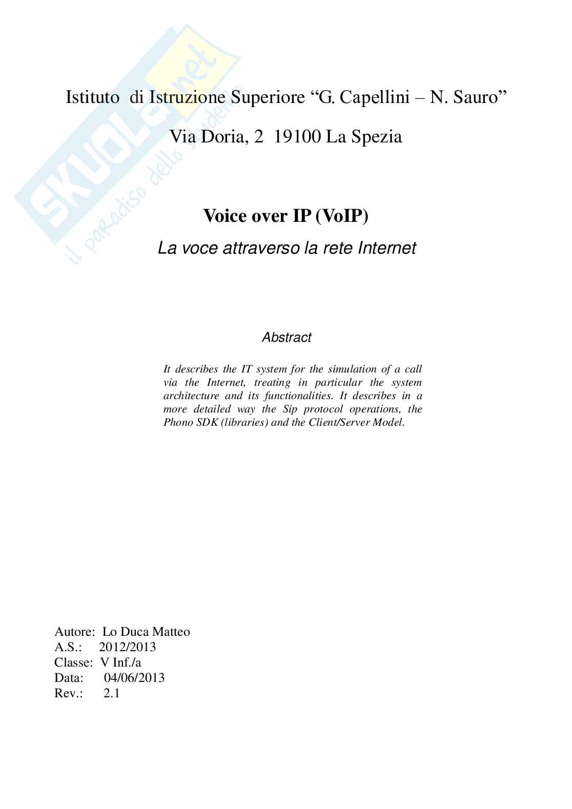 La mia tesina di maturità verte sul Voice over IP. La tecnologia VoIP (Voice over IP) è sempre più diffusa nella società della comunicazione, utilizzata tramite il tradizionale computer o attraverso sempre più sofisticatri dispositivi mobili. In Telecomunicazioni e Informatica, con Voice over IP si intende una tecnologia che rende possibile effettuare una conversazione telefonica sfruttando una connessione Internet o una qualsiasi altra rete dedicata (a commutazione di pacchetto) che utilizzi il protocollo IP per il trasporto dei dati. Più specificamente con VoIP si intende l'insieme dei protocolli di comunicazione di strato applicativo che rendono possibile tale tipo di comunicazione. Grazie a numerosi provider VoIP è possibile effettuare telefonate anche verso la rete telefonica tradizionale (PSTN).