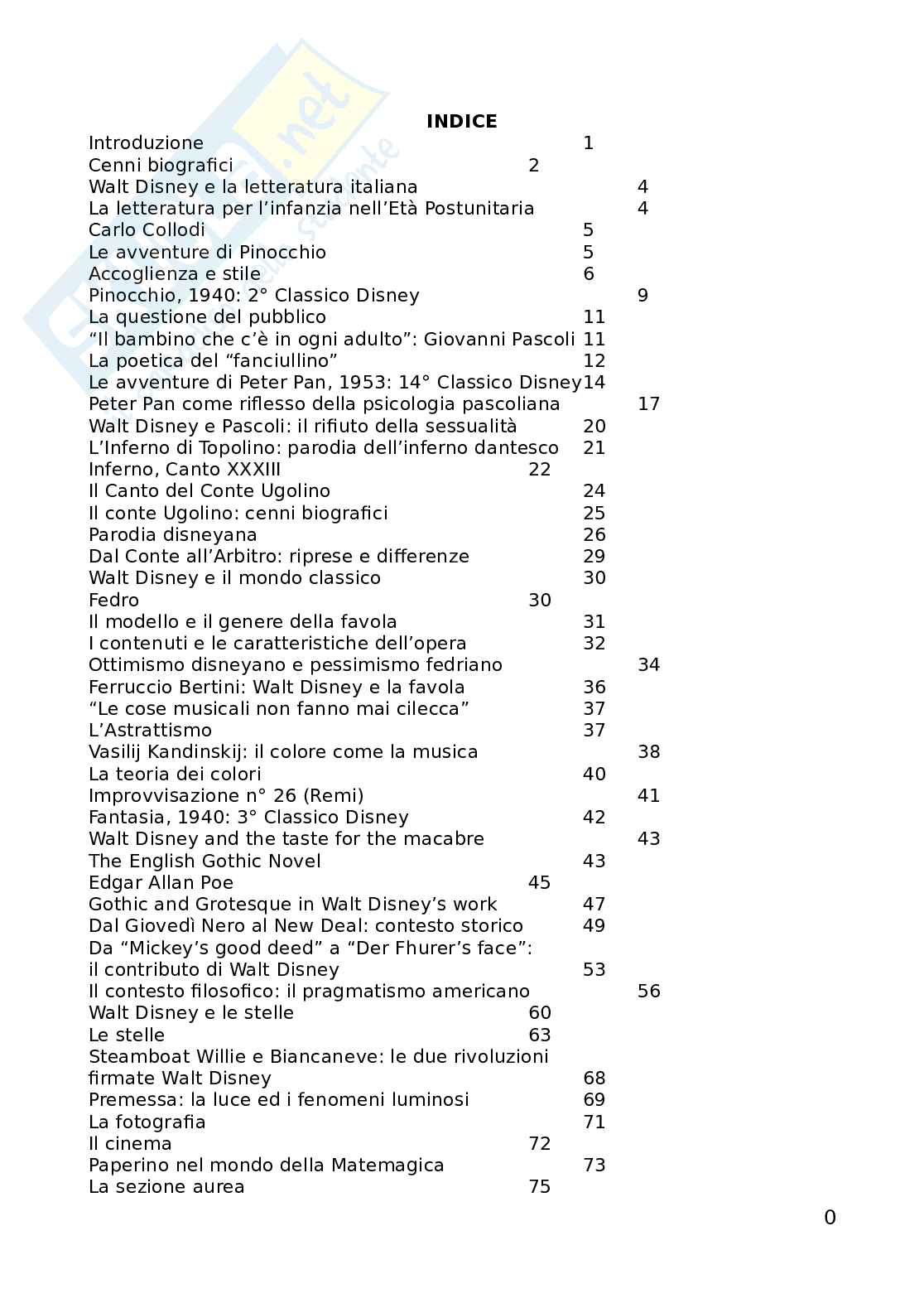 La seguente tesina di maturità tratta di Walt Disney. La tesina abbraccia anche i seguenti argomenti nella varie discipline scolastiche: Carlo Collodi e Le avventure di Pinocchio; Giovanni Pascoli e il Fanciullino; Divina Commedia: il Canto del Conte Ugolino in Italiano; Le favole di Fedro in Latino; l'Astrattismo e Kandinskij in Storia dell'Arte; The English Gothic Novel and Edgar Allan Poe in Inglese; Dal Giovedì Nero al New Deal in Storia; Il pragmatismo americano e Dewey in Filosofia; Le stelle in Geografia astronomica; La luce, la fotografia e il cinema in Fisica; La sezione aurea in Matematica.