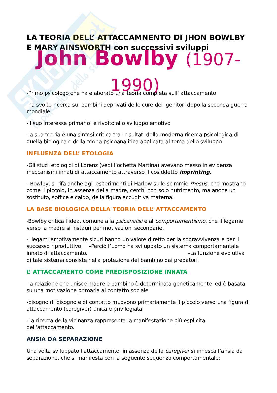 -Primo psicologo che ha elaborato una teoria completa sull’ attaccamento