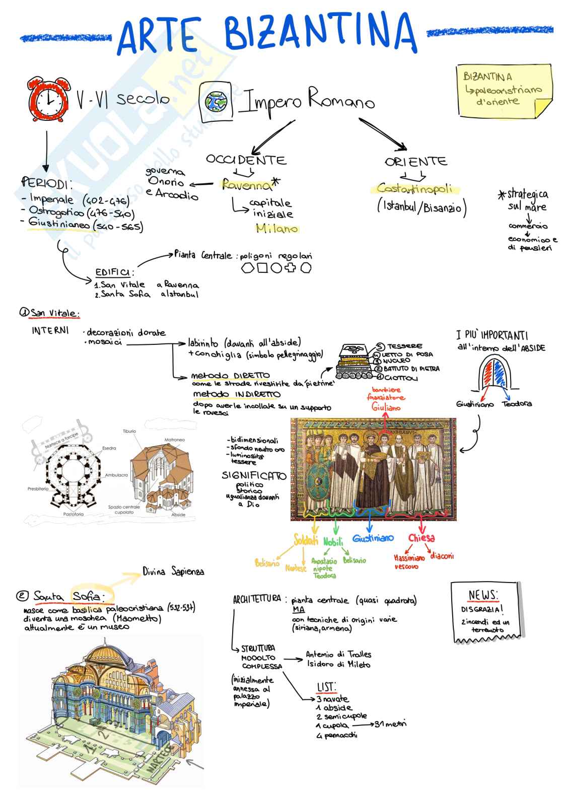 Le sezioni di tempo individuate sono: periodo imperiale (402-476), periodo ostrogotico (476-540) ed infine il periodo giustinianeo (540-565). L’ultimo citato è considerato di splendore ed evoluzione, infatti in esso vennero costruiti due edifici molto importanti: Basilica di San Vitale a Ravenna e Basilica di Santa Sofia a Bisanzio. Entrambi possiedono una pianta centrale (con poligoni regolari quali il cerchio, quadrato, esagono, ottagono, croce greca,...)