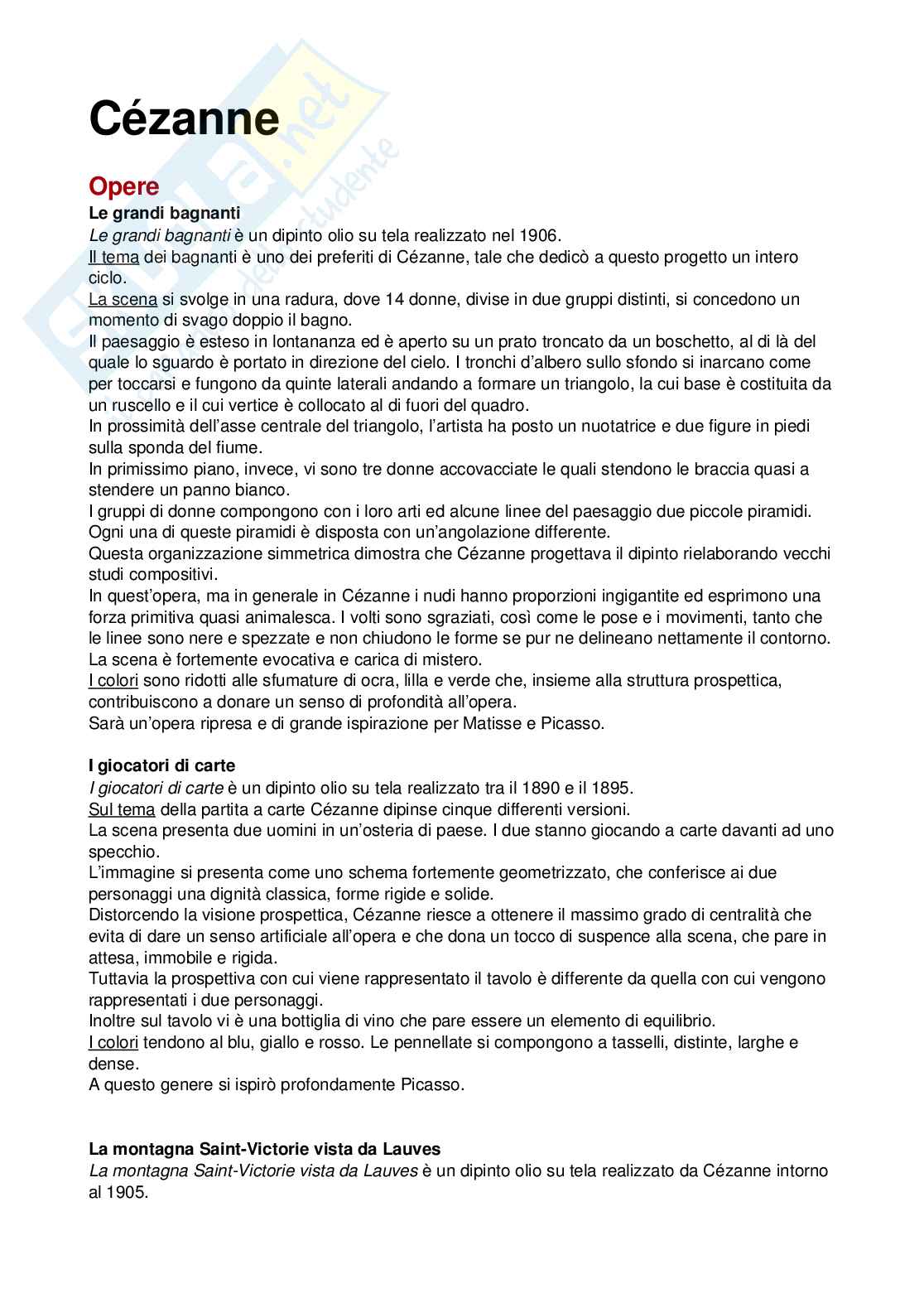 Le grandi bagnanti è un dipinto olio su tela realizzato nel 1906. Il tema dei bagnanti è uno dei preferiti di Cézanne, tale che dedicò a questo progetto un intero ciclo. La scena si svolge in una radura, dove 14 donne, divise in due gruppi distinti, si concedono un momento di svago doppio il bagno. Il paesaggio è esteso in lontananza ed è aperto su un prato troncato da un boschetto, al di là del quale lo sguardo è portato in direzione del cielo. I tronchi d’albero sullo sfondo si inarcano come per toccarsi e fungono da quinte laterali andando a formare un triangolo, la cui base è costituita da un ruscello e il cui vertice è collocato al di fuori del quadro. In prossimità dell’asse centrale del triangolo, l’artista ha posto un nuotatrice e due figure in piedi sulla sponda del fiume. In primissimo piano, invece, vi sono tre donne accovacciate le quali stendono le braccia quasi a stendere un panno bianco. I gruppi di donne compongono con i loro arti ed alcune linee del paesaggio due piccole piramidi. Ogni una di queste piramidi è disposta con un’angolazione differente. Questa organizzazione simmetrica dimostra che Cézanne progettava il dipinto rielaborando vecchi studi compositivi. In quest’opera, ma in generale in Cézanne i nudi hanno proporzioni ingigantite ed esprimono una forza primitiva quasi animalesca. I volti sono sgraziati, così come le pose e i movimenti, tanto che le linee sono nere e spezzate e non chiudono le forme se pur ne delineano nettamente il contorno. La scena è fortemente evocativa e carica di mistero. I colori sono ridotti alle sfumature di ocra, lilla e verde che, insieme alla struttura prospettica, contribuiscono a donare un senso di profondità all’opera. Sarà un’opera ripresa e di grande ispirazione per Matisse e Picasso.