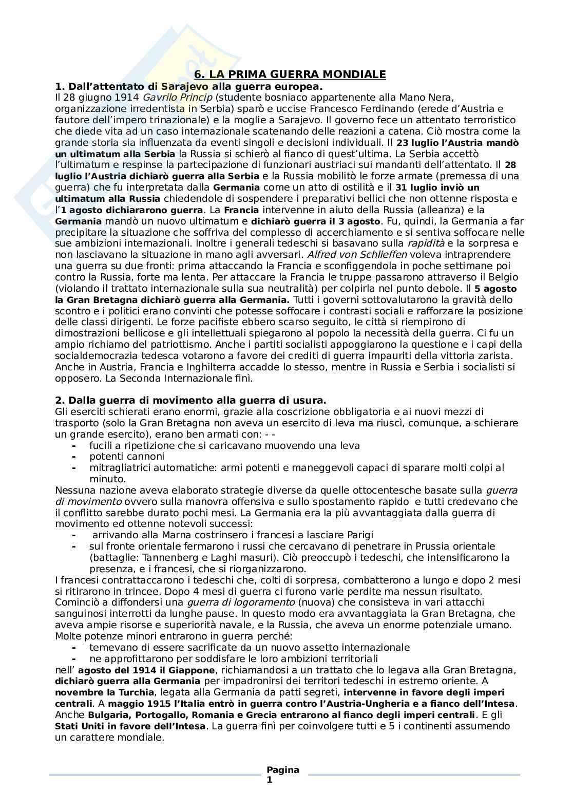 Il 28 giugno 1914 Gavrilo Princip (studente bosniaco appartenente alla Mano Nera, organizzazione irredentista in Serbia) sparò e uccise Francesco Ferdinando (erede d’Austria e fautore dell’impero trinazionale) e la moglie a Sarajevo. Il governo fece un attentato terroristico che diede vita ad un caso internazionale scatenando delle reazioni a catena. Ciò mostra come la grande storia sia influenzata da eventi singoli e decisioni individuali. Il 23 luglio l’Austria mandò un ultimatum alla Serbia la Russia si schierò al fianco di quest’ultima. La Serbia accettò l’ultimatum e respinse la partecipazione di funzionari austriaci sui mandanti dell’attentato. Il 28 luglio l’Austria dichiarò guerra alla Serbia e la Russia mobilitò le forze armate (premessa di una guerra) che fu interpretata dalla Germania come un atto di ostilità e il 31 luglio inviò un ultimatum alla Russia chiedendole di sospendere i preparativi bellici che non ottenne risposta e l’1 agosto dichiararono guerra. La Francia intervenne in aiuto della Russia (alleanza) e la Germania mandò un nuovo ultimatum e dichiarò guerra il 3 agosto. Fu, quindi, la Germania a far precipitare la situazione che soffriva del complesso di accerchiamento e si sentiva soffocare nelle sue ambizioni internazionali. Inoltre i generali tedeschi si basavano sulla rapidità e la sorpresa e non lasciavano la situazione in mano agli avversari. Alfred von Schlieffen voleva intraprendere una guerra su due fronti: prima attaccando la Francia e sconfiggendola in poche settimane poi contro la Russia, forte ma lenta. Per attaccare la Francia le truppe passarono attraverso il Belgio (violando il trattato internazionale sulla sua neutralità) per colpirla nel punto debole. Il 5 agosto la Gran Bretagna dichiarò guerra alla Germania. Tutti i governi sottovalutarono la gravità dello scontro e i politici erano convinti che potesse soffocare i contrasti sociali e rafforzare la posizione delle classi dirigenti. Le forze pacifiste ebbero scarso seguito, le città si riempirono di dimostrazioni bellicose e gli intellettuali spiegarono al popolo la necessità della guerra. Ci fu un ampio richiamo del patriottismo. Anche i partiti socialisti appoggiarono la questione e i capi della socialdemocrazia tedesca votarono a favore dei crediti di guerra impauriti della vittoria zarista. Anche in Austria, Francia e Inghilterra accadde lo stesso, mentre in Russia e Serbia i socialisti si opposero. La Seconda Internazionale finì.