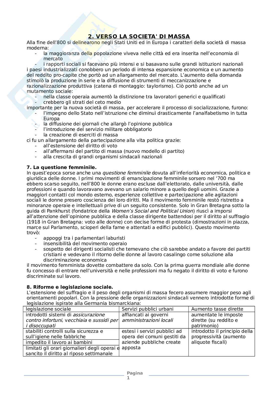In quest’epoca sorse anche una questione femminile dovuta all’inferiorità economica, politica e giuridica delle donne. I primi movimenti di emancipazione femminile sorsero nel ‘700 ma ebbero scarso seguito, nell’800 le donne erano escluse dall’elettorato, dalle università, dalle professioni e quando lavoravano avevano un salario minore a quello degli uomini. Grazie a maggiori contatti col mondo esterno, esperienze collettive e partecipazione alle agitazioni sociali le donne presero coscienza dei loro diritti. Ma il movimento femminile restò ristretto a minoranze operaie e intellettuali prive di un seguito consistente. Solo in Gran Bretagna sotto la guida di Pankhurst (fondatrice della Women’s Social and Political Union) riuscì a imporsi all’attenzione dell’opinione pubblica e della classe dirigente battendosi per il diritto al suffragio (1918 in Gran Bretagna: voto alle donne) con decise forme di protesta (dimostrazioni in piazza, marce sul Parlamento, scioperi della fame e attentati a edifici pubblici). Questo movimento trovò: