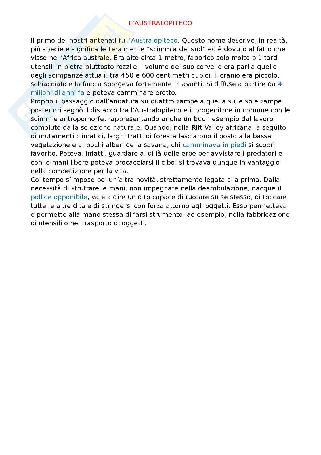 Il primo dei nostri antenati fu l’australopiteco. Questo nome descrive in realtà più specie e significa letteralmente "scimmia del sud" ed è dovuto al fatto che visse nell’Africa australe. Era alto circa un metro, fabbricò solo molto più tardi utensili in pietra piuttosto rozzi e il volume del suo cervello era pari a quello degli scimpanzé attuali: tra 450 e 600 centimetri cubici. Il cranio era piccolo, schiacciato e la faccia sporgeva fortemente in avanti. Si diffuse a partire da quattro milioni di anni fa e poteva camminare eretto.