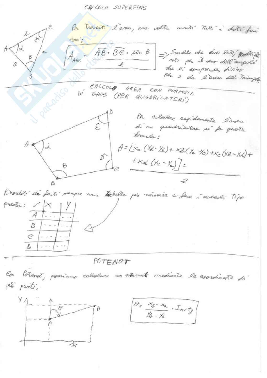 Per quanto riguarda la topografia è possibile presentare delle illustrazioni grafiche del calcolo delle superfici di varie figure geometriche. La prima formula è quella inerente i triangoli qualsiasi. La seconda è la formula di Gaus che serve per calcolare la superficie di un quadrilatero. Infine viene anche spiegata in maniera chiara anche la formula del teorema di Potenot per calcolare un azimut.