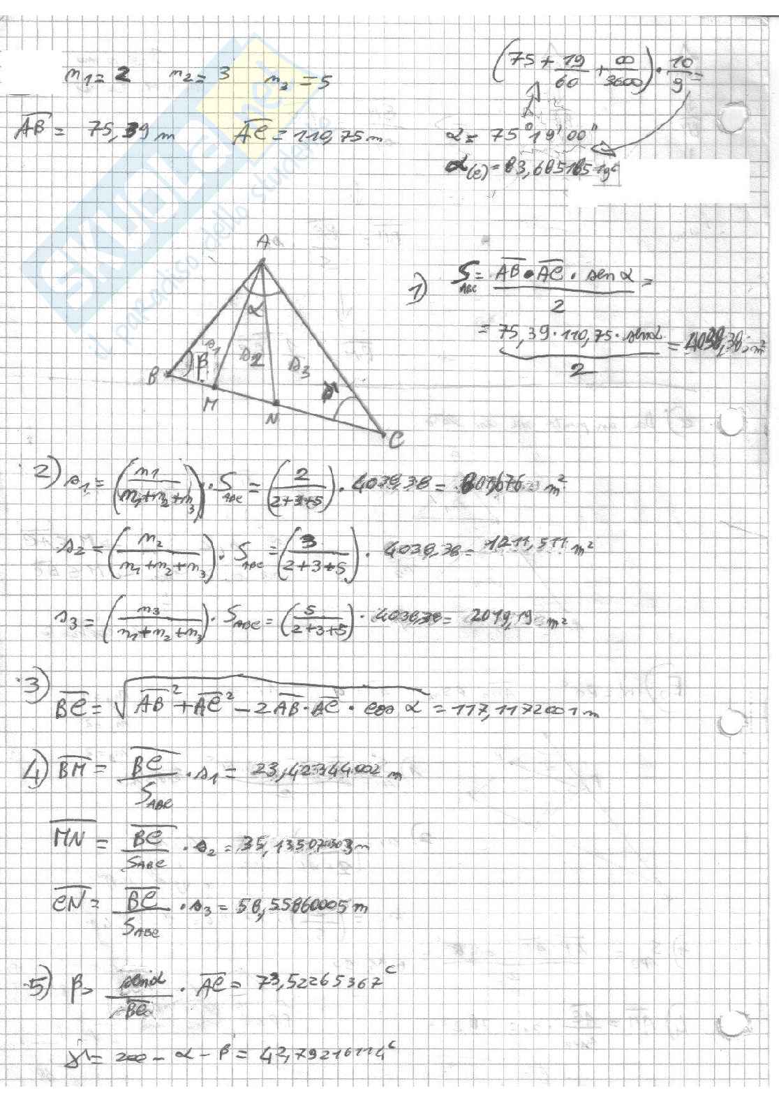 In questo allegato viene spiegata la divisione di un terreno triangolare con dividenti uscenti da un vertice. Inoltre è presente la risoluzione di un triangolo rappresentante un terreno. In questo allegato inoltre viene illustrata la procedura di calcolo necessaria per risolvere la divisione delle aree di un terreno a forma triangolare. In questo caso le dividenti delle aree usciranno entrambe da un vertice. Questo argomento viene spiegato attraverso un esercizio.
