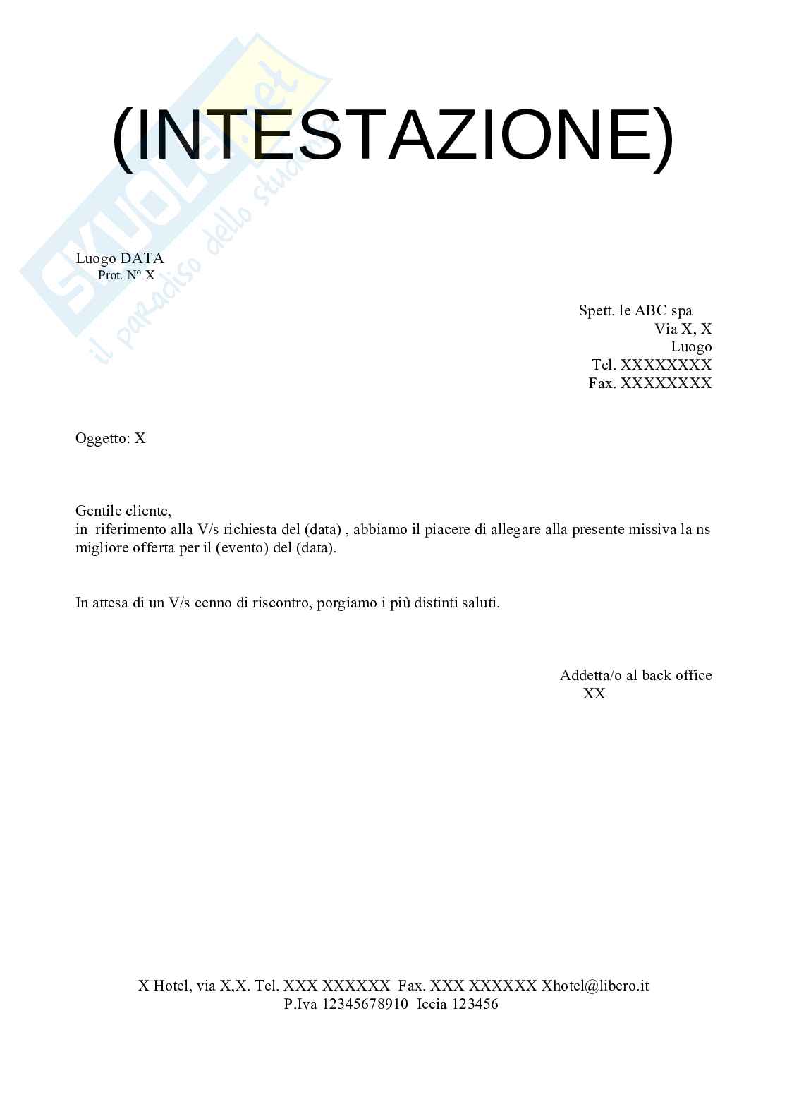 Appunto contenente il Fac simile di lettera commerciale in tutte le sue parti. Utile per esercitazioni di Ricevimento.