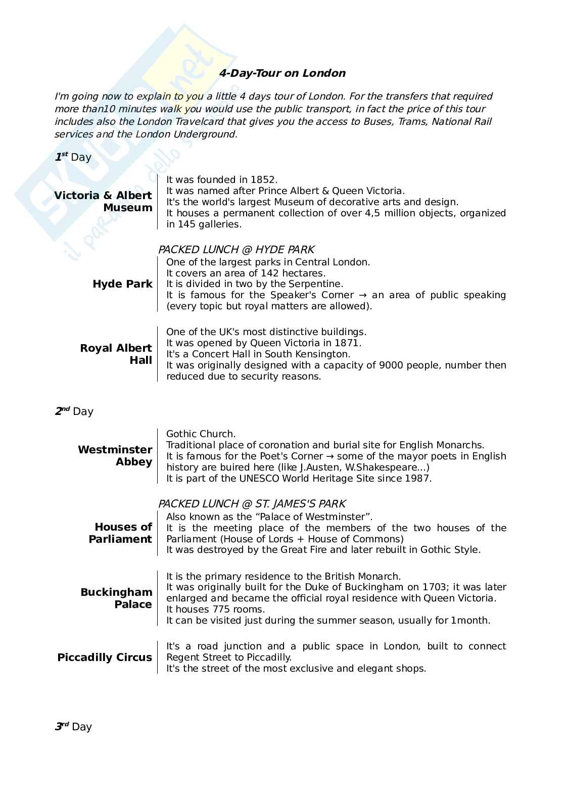 I'm going now to explain to you a little four days tour of London. For the transfers that required more than 10 minutes walk You would use the public transport, in fact the price of this tour includes also the London Travel card that gives You the access to Buses, Trams, National Rail services and the London Underground.