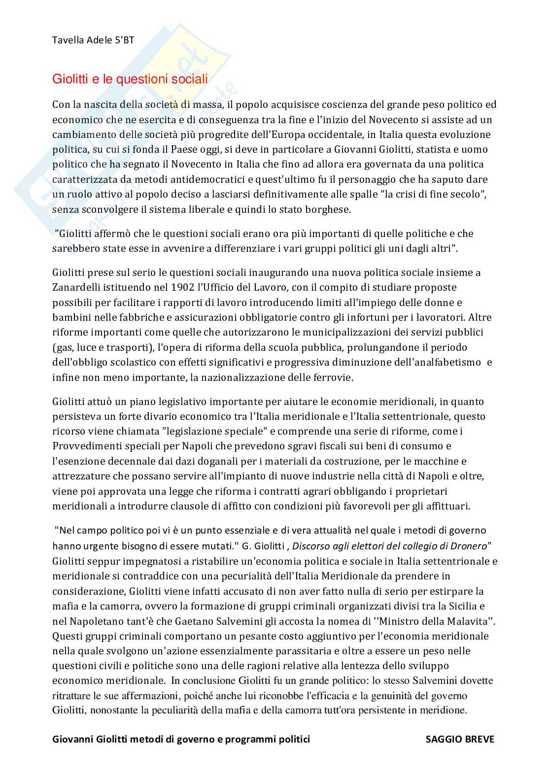 Saggio breve su Giovanni Giolitti e le questioni sociali