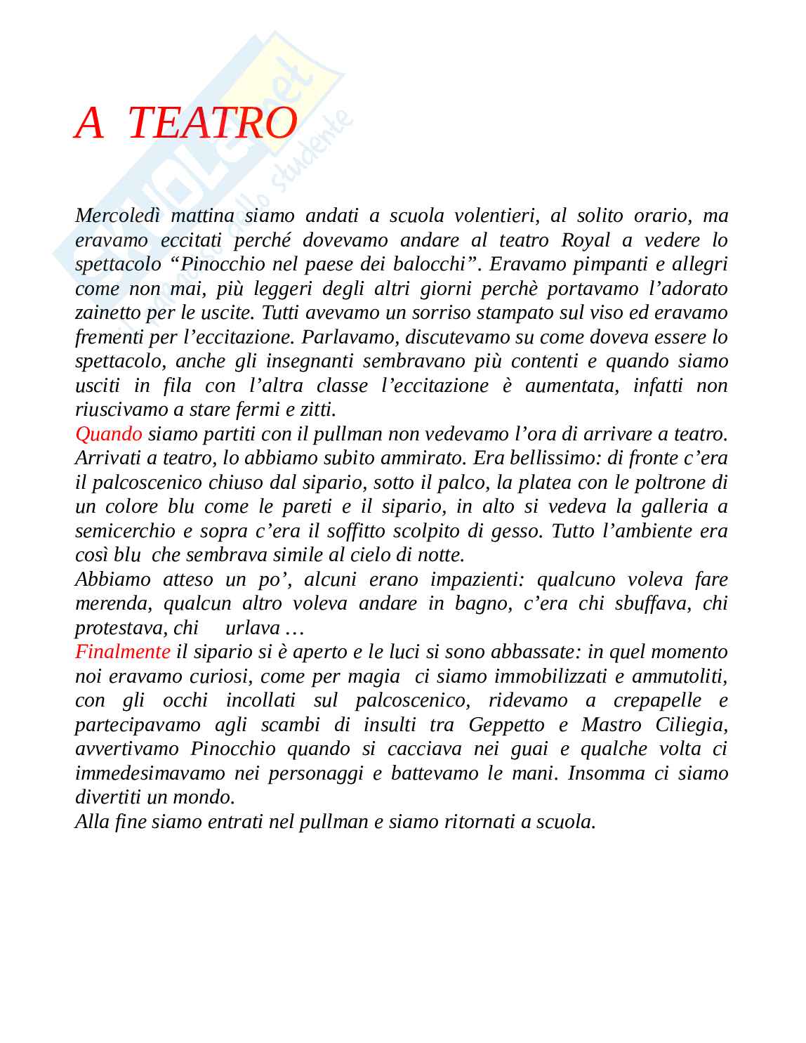 Un mercoledì mattina siamo andati a scuola volentieri, al solito orario, ma eravamo eccitati perché dovevamo andare al teatro Royal a vedere lo spettacolo Pinocchio nel paese dei balocchi. Eravamo pimpanti e allegri come non mai, più leggeri degli altri giorni perchè portavamo l’adorato zainetto per le uscite. Tutti avevamo un sorriso stampato sul viso ed eravamo frementi per l’eccitazione. Parlavamo, discutevamo su come doveva essere lo spettacolo, anche gli insegnanti sembravano più contenti e quando siamo usciti in fila con l’altra classe l’eccitazione è aumentata, infatti non riuscivamo a stare fermi e zitti.