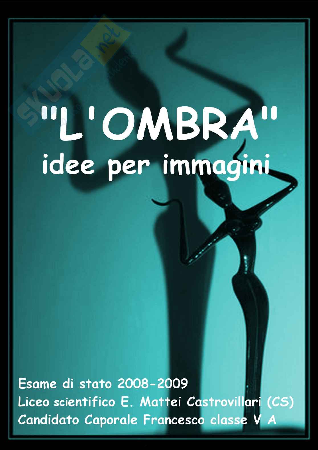 Sommario: Arte: la corrente metafisica, De Chirico: la figura dell'uomo-automa, sostituita dalla donna-ombra, entrambi privi di espressione facciale. Italiano: Pirandello e la poetica dell'Umorismo: l'ombra in relazione al contrasto tra forma e vita che investe soprattutto il romanzo "Il fu Mattia Pascal" Italiano: Montale, "Non chiederci la parola" da Ossi di seppia": l'uomo che non si cura della sua ombra, ovvero della sua collocazione nella realtà . Filosofia: l'introspezione psicoanalitica di Freud opposta a quella etica di Seneca. Entrambi, come ostetrici, fanno partorire la parte più nascosta dell'uomo. Ecco spiegato il disegno. Filosofia:Netzsche, "Il viandante e la sua ombra" da "Umano, troppo umano": l'ombra come dialogo con sè stessi. Inglese:Oscar Wilde, "Il ritratto di Dorian Gray": l'ombra come specchio dell'anima. Inglese: Stevenson, "Doctor Jekyll and Mr. Hyde": l'ombra come realtà nascosta; essa è strettamente collegata al tema del doppio. Storia: il Nazismo, Hitler e la propaganda: l'ombra come burattinaia di un sogno. Geografia Astronomica: l'eclissi di sole: l'ombra come fenomeno naturale.