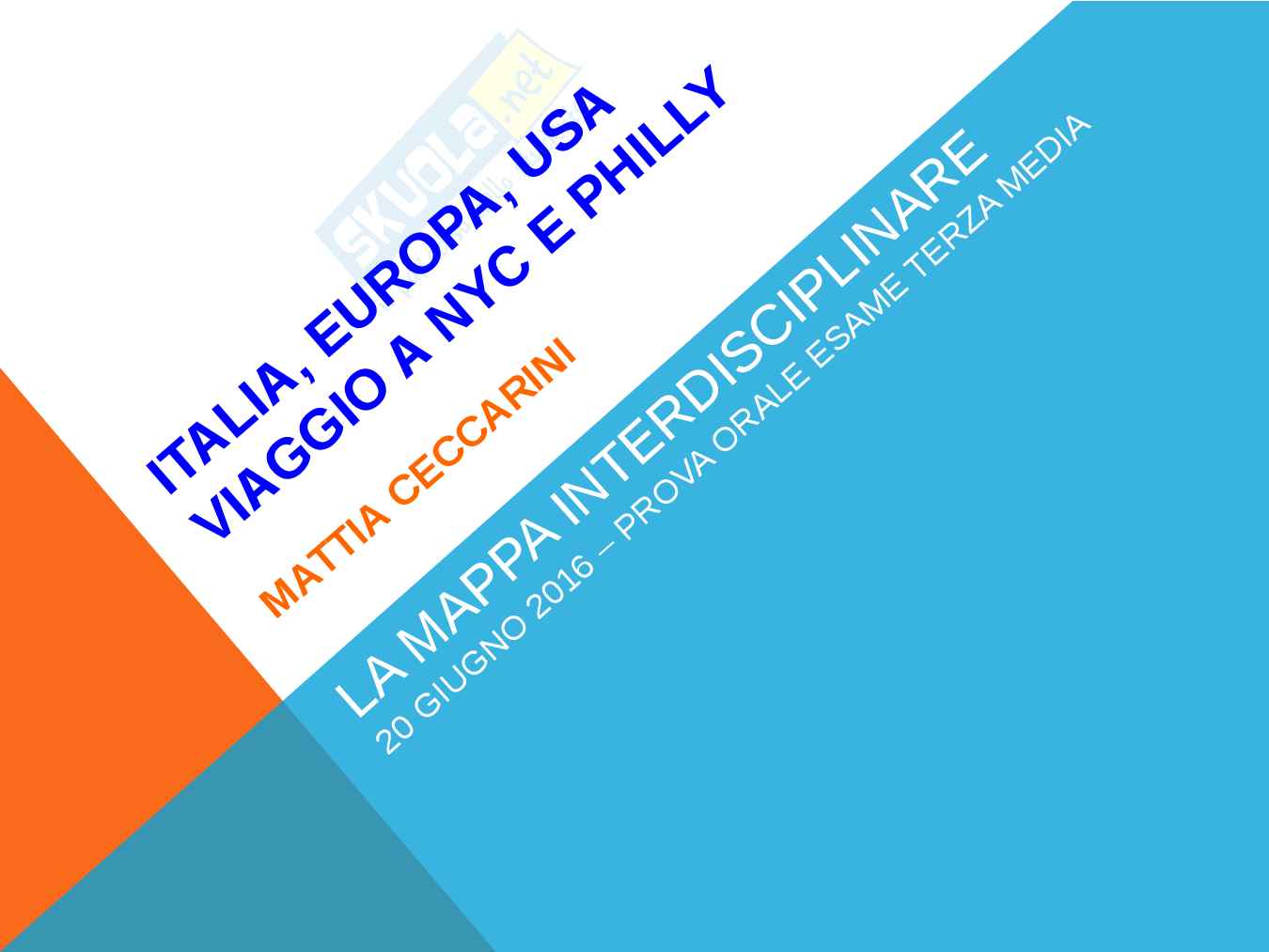 La seguente tesina di terza media descrive il viaggio tra Italia, Europa e Stati Uniti attraverso New York City e Phily. La tesina permette di affrontare i seguenti argomenti: in Storia e italiano Martin Luter King e la pace, in Matematica la struttura della città americana e il piano cartesiano, in Geometria i grattacieli e i solidi, in Tecnologia e scienze l'energia e centrali nucleari in USA, in Musica l'inno USA e suo significato (ascoltabile nel PWP), in Educazione fisica il pugilato e Rocky Balboa (immigrazione italo-americana) a Philadelphia, in Geografia le nozioni generali sul paese, in Educazione Civica la forma di governo negli USA, in Arte il MOMA e i pittori moderni, in Inglese le differenze tra American e British English e in Francese la statua della libertà, F. Bartholdi e G. Eiffel.