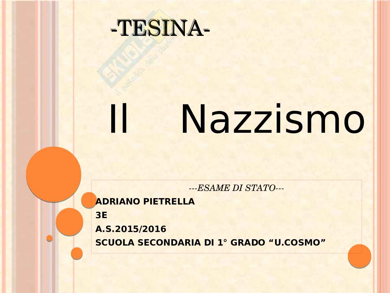 Questa tesina di terza media descrive il nazismo. La tesina permette i collegamenti con le seguenti materie scolastiche: in Storia il nazismo, in Italiano Il bambino con il pigiama a righe, in Geografia il Giappone (paese alleato di Hitler), in Educazione fisica le Olimpiadi di Berlino del 1936, Tecnologia il petrolio (risorsa sfruttata da Hitler), in Musica Mozart e in scienze il sistema nervoso.