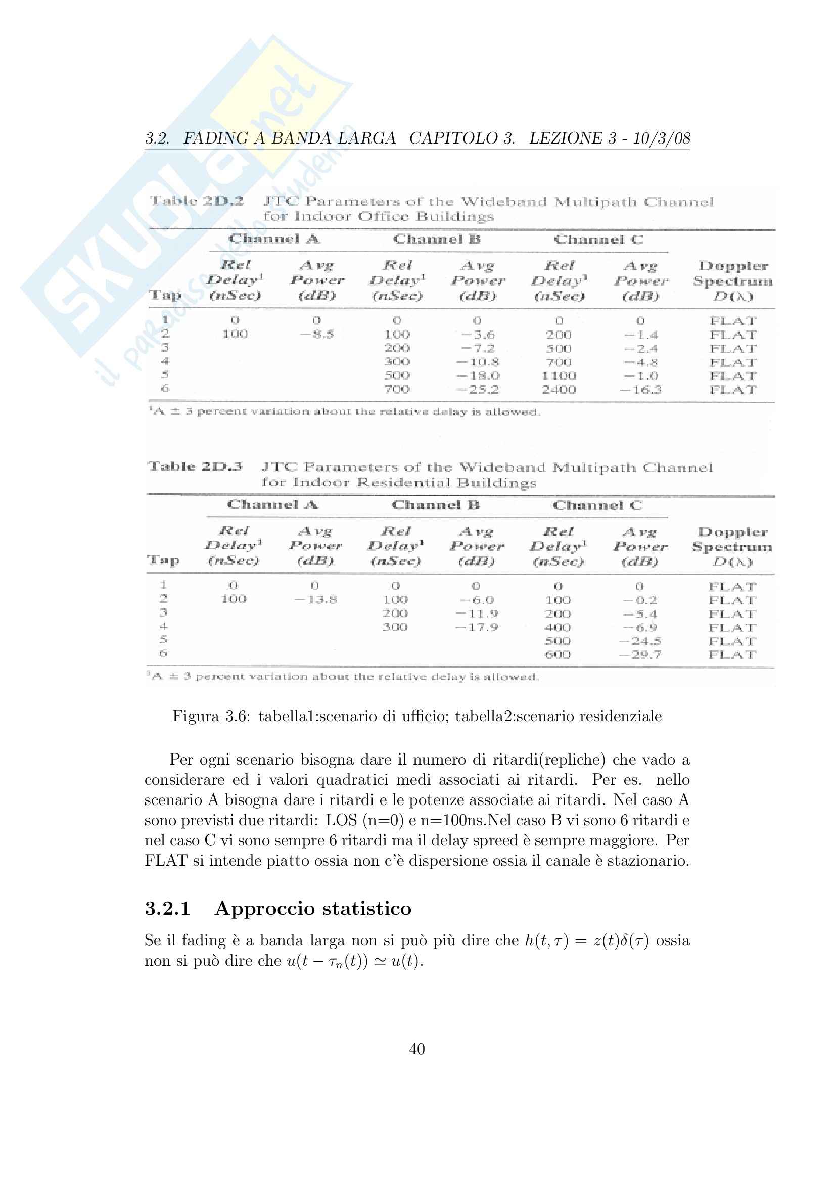 Le quattro coppie di bit del blocco determinano quattro fasi: φ, φ, φ, φ 0,1 2 3 4 2c rappresenta la parola codice di 8 bit: j(φ +φ +φ +φ) j(φ +φ +φ) j(φ +φ +φ) j(φ +φ) j(φ +φ +φ) j(φ +φ) j(φ +φ) jφ≡c e ,e ,e ,e ,e ,e ,e ,e 1 2 3 4 1 3 4 1 2 4 1 4 1 2 3 1 3 1 2 1 A sequenze di 8 bit differenti corrispondono 8 bit differenti. Le parole codice sono 4^8 = 256. In ogni componente compare sempre φ per cui φ1 1 può essere messo in evidenza e considerare 64 parole codice. Per giungere a⇒256 basta fare 64*4 poiché φ può assumere 4 valori. φ determina una1 1 rotazione di fase su tutti i chip cioè una modulazione 4-PSK su tutti i chip. 686.1. MODULAZIONE CCK CAPITOLO 6. LEZIONE 6 - 7/4/08 Figura 6.2: esempio CCK La tabella seguente mostra la cross-relazione tra le parole codice e dimostra che non tutte le parole sono ortogonali.Magnitude rappresenta l'ampiezza del prodotto scalare, il number il numero di parole codice ortogonali. 696.1. MODULAZIONE CCK CAPITOLO 6. LEZIONE 6 - 7/4/08