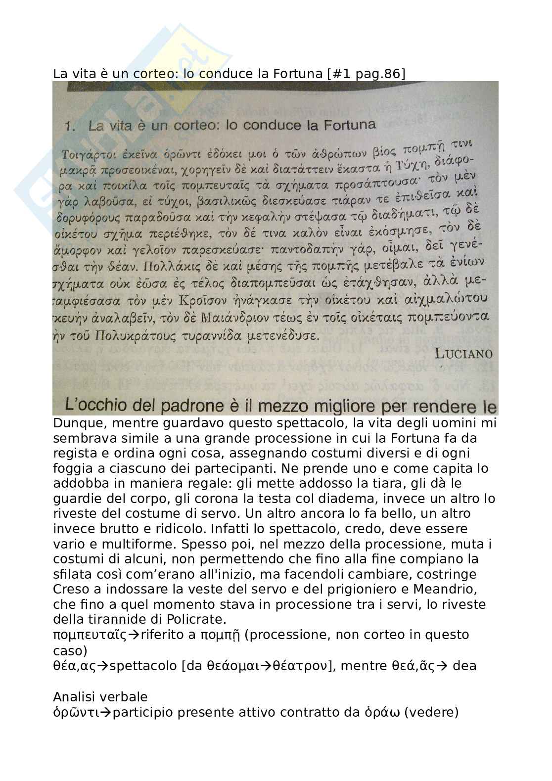 Dunque, mentre guardavo questo spettacolo, la vita degli uomini mi sembrava simile a una grande processione in cui la Fortuna fa da regista e ordina ogni cosa, assegnando costumi diversi e di ogni foggia a ciascuno dei partecipanti. Ne prende uno e come capita lo addobba in maniera regale: gli mette addosso la tiara, gli dà le guardie del corpo, gli corona la testa col diadema, invece un altro lo riveste del costume di servo. Un altro ancora lo fa bello, un altro invece brutto e ridicolo. Infatti lo spettacolo, credo, deve essere vario e multiforme. Spesso poi, nel mezzo della processione, muta i costumi di alcuni, non permettendo che fino alla fine compiano la sfilata così com'erano all'inizio, ma facendoli cambiare, costringe Creso a indossare la veste del servo e del prigioniero e Meandrio, che fino a quel momento stava in processione tra i servi, lo riveste della tirannide di Policrate.