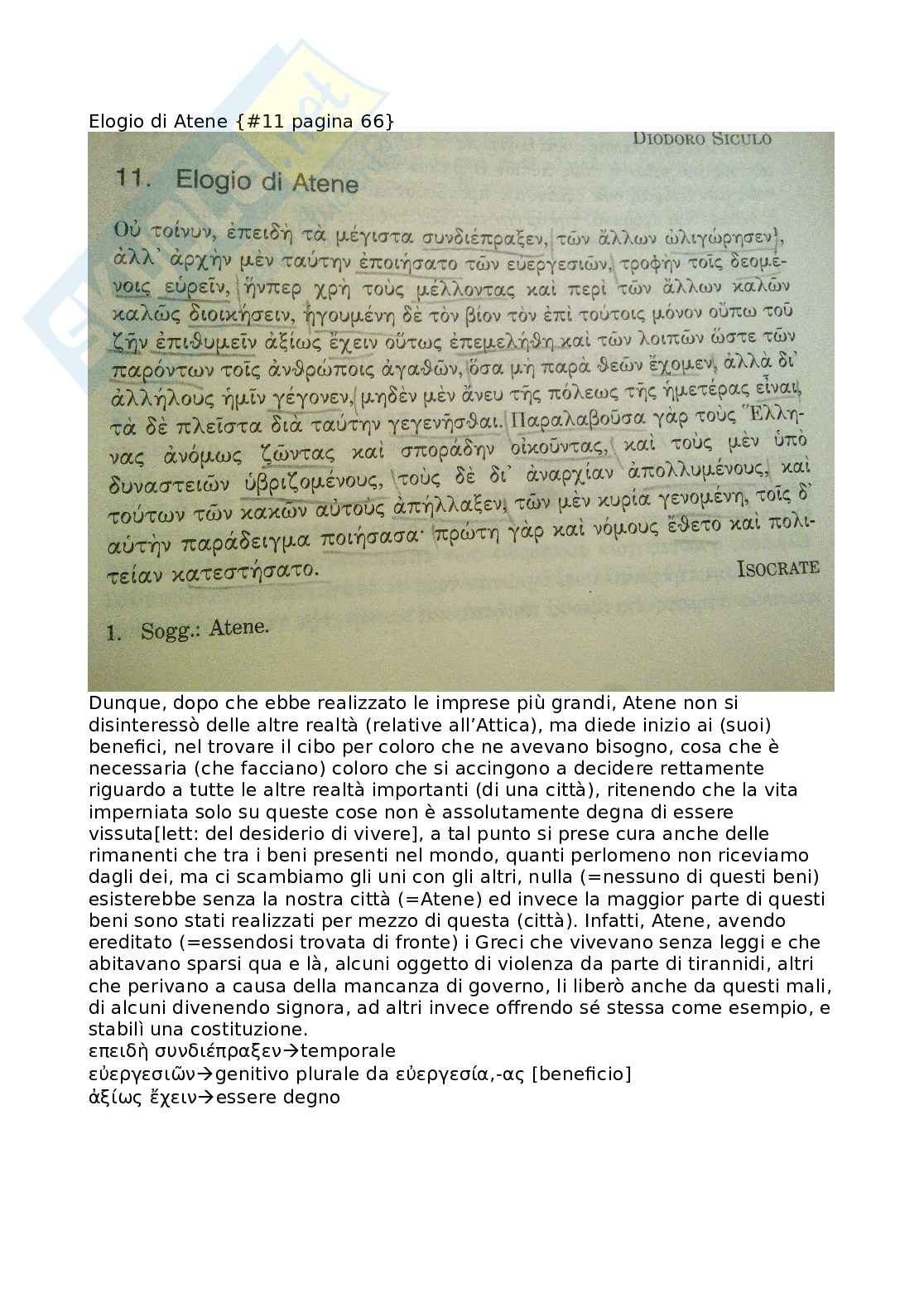 Dunque, dopo che ebbe realizzato le imprese più grandi, Atene non si disinteressò delle altre realtà (relative all’Attica), ma diede inizio ai (suoi) benefici, nel trovare il cibo per coloro che ne avevano bisogno, cosa che è necessaria (che facciano) coloro che si accingono a decidere rettamente riguardo a tutte le altre realtà importanti (di una città), ritenendo che la vita imperniata solo su queste cose non è assolutamente degna di essere vissuta[lett: del desiderio di vivere], a tal punto si prese cura anche delle rimanenti che tra i beni presenti nel mondo, quanti perlomeno non riceviamo dagli dei, ma ci scambiamo gli uni con gli altri, nulla (=nessuno di questi beni) esisterebbe senza la nostra città (=Atene) ed invece la maggior parte di questi beni sono stati realizzati per mezzo di questa (città).